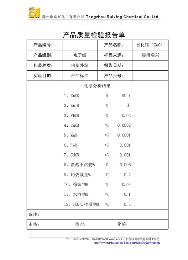 瑞興化工有限公司是生產氧化鋅的重點企業,于2008年通過ISO9001:2008質量管理體系認證。“瑞興”牌氧化鋅在國內擁有較大穩(wěn)定的市場,并遠銷東南亞、中東、中南美等國家和地區,在國內外享有較高聲譽。